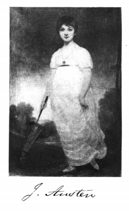 This is a portrait of Jane Austen, said to have been painted when she was fifteen years old in Bath. The painting was done by Johann Zoffany. At the time of printing of this edition, the painting was in the possession of Reverend J. Morland Rice, Rector of Bramber, Sussex, grandson of Jane Austen’s brother, Edward. It was reproduced with permission of Rev. Rice as the frontispiece of this collection of Austen’s novels. According to information in the list of illustrations, the painting belonged to Colonel Austen of Kippington, a descendant of Jane Austen’s great-uncle, Uncle Francis, and was a friend of her father. Colonel Austen then gave it to his friend, Mrs. Hardinge-Newman who greatly admired Austen's novels. Mrs. Hardinge-Newman's stepson, Dr. Hardinge-Newman, left it to Mr. Rice. In this painting, Austen wears a dress in the traditional regency style with an empire waist. Her hair is worn up, and she holds a parasol. The same image appears as the frontispiece for the Dent 1893, 1894, 1895, 1896, and 1897 editions of Sense and Sensibility.