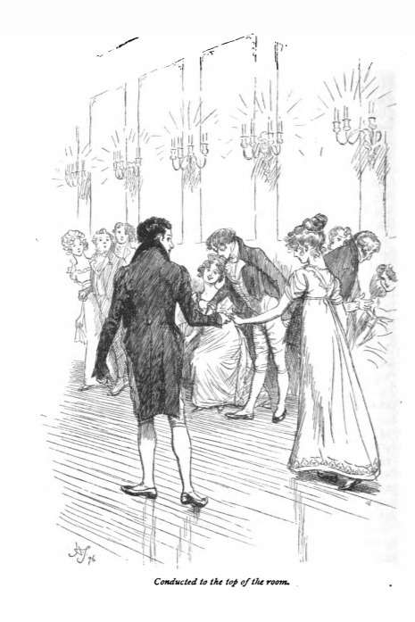 Here we see Mr. Crawford leading Fanny to the dance floor to open the ball. Sir Thomas gave the ball in honour of William’s visit to Mansfield. It was at this time when Mr. Crawford decided he wanted to make Fanny love him. At the ball, Sir Thomas came over to ask if she had a partner for the first dance. She answered that Mr. Crawford had engaged her for the first two dances. Then Sir Thomas told her that she was to open the dancing with Mr. Crawford. She was shocked and tried to convince him that Edmund should open the dancing with Miss Crawford because she was very shy. Sir Thomas insisted, and Fanny relented and began the dancing with Mr. Crawford. This scene occurs in chapter 28. The characters are shown in the traditional regency style. Fanny wears a regency style dress with an empire waist. Mr. Crawford wears a tailcoat and breeches. The regency period dated to the early nineteenth century (1811-1820) when George, Prince of Wales, later George IV (r. 1820-1830), reigned as regent for his mentally ill father, King George III (r. 1760-1820). The regency period is associated with the rise of neoclassicism in art and fashion.