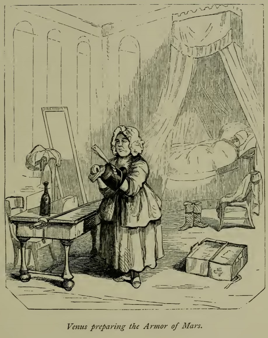 Peggy O’Dowd stands in her bedroom, brushing her husband’s cap. His sword lies on the table in front of her, along with a bottle and a large mirror. She has already packed his travelling-valise, which lies open on the ground next to her. Major O’Dowd himself is sleeping in the background, with his boots next to the bed and his coat thrown over a chair. Below the illustration is printed its title, Venus preparing the Armor of Mars.