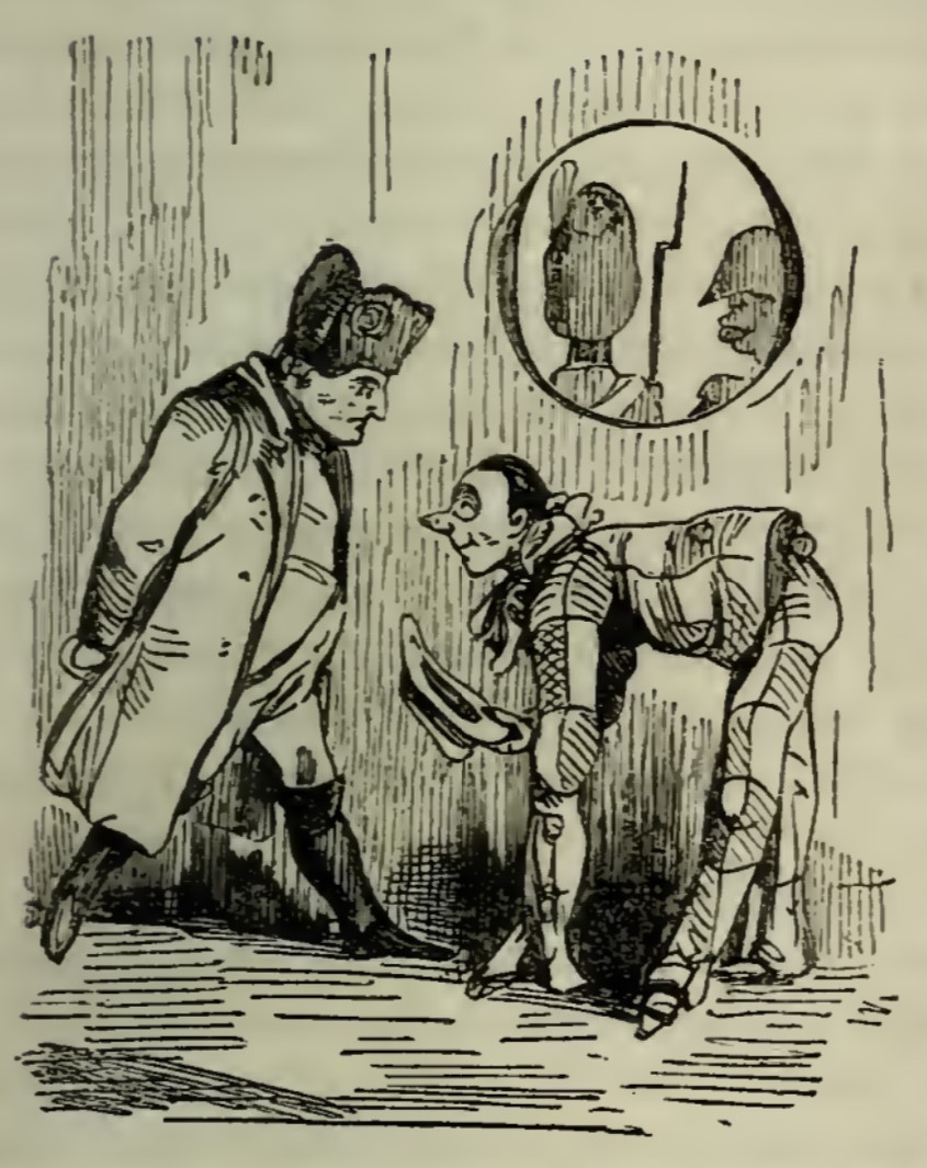 - A jester in a checkered suit with a large ruff, holding his hat in his hand, bows deeply to a man in military uniform. A window, through which the heads of two soldiers can be seen, forms the letter O from Our.