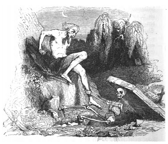 After Gulliver spoke about the wonders of immortality, a diplomat from Luggnag corrected him. The diplomat explained that while elsewhere in the world most people did not want to die, saying that even with one foot in the grave they would try and hang onto life. This is the image shown here. A skeleton, representing death, tries to pull a man into his grave, while the man pulls away, holding onto the cliff, representing life. The diplomat from Luggnagg explained that on the island, most people did not have this same resistance to death because they could see people who were immortal. These immortals would not die, but would continue to age, thus their quality of life would continue to deteriorate forever. The same image appears in the 1839 Krabbe edition.