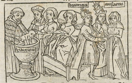 The left side of this engraving depicts Constance, the daughter of king William of Sicily, marrying Henry, the emperor of Rome. Constance is on the far-left with her name engraved above her head, while Henry is depicted holding her hand as the priest marries them. Henry’s name is also engraved above his head to identify him. Constance was forced to be a nun at a young age as a prophecy foretold Constance would somehow cause the destruction of Sicily. Her father, William, put her in a convent to prevent the prophecy from happening. At an older age, Constance was married to emperor Henry and bore a son at the age of 55. Constance is depicted in the centre of the engraving lying in a bed after giving birth to her son, Frederick. Frederick is depicted getting baptized in a large bowl which has his name engraved on the front. The baby grows up to be the one to fulfill the prophecy that King William was fearful of.