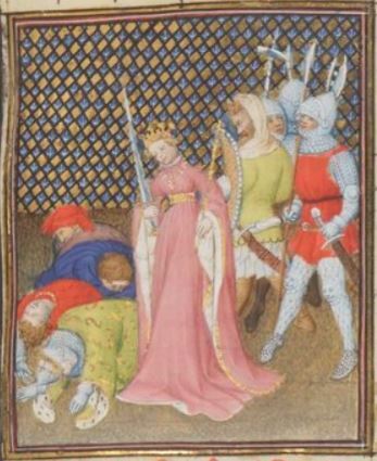 This illumination depicts Artemisia, the queen of Caria, standing in the centre of the image holding a sword as she looks down at dead bodies on the ground. She has soldiers dressed in armor standing behind her. Boccaccio explains that Artemisia was renowned for her military leadership as she had taken up arms against enemies multiple times.