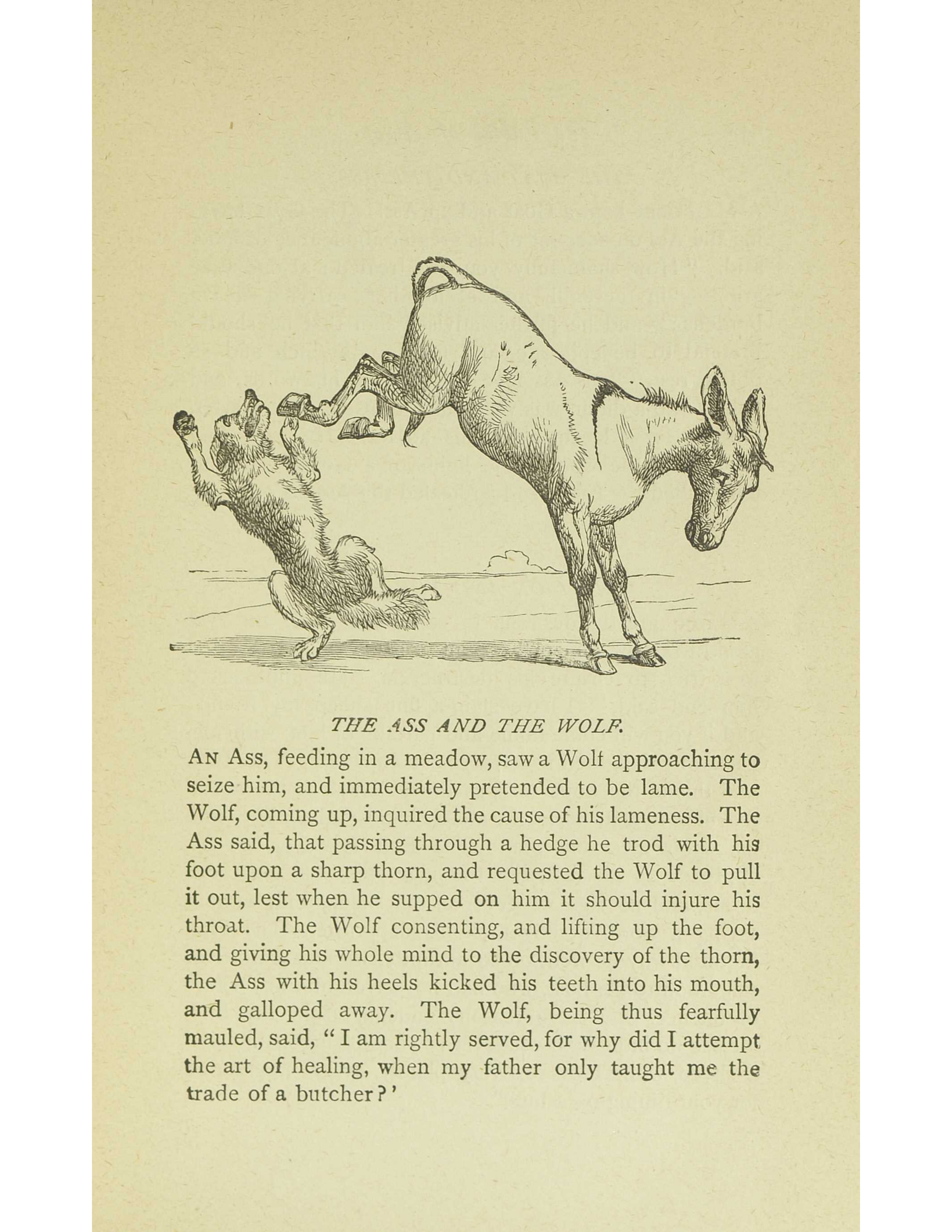 - On the right side of the image, an ass is bracing itself on its front legs as it kicks back with its hind ones. Behind the ass is a wolf. With the impact from the ass’s kick, the wolf is thrown back. The wolf stands on one hind leg, and its two front legs are up next to its head as it falls back.