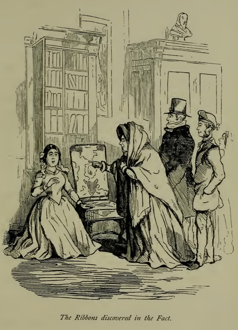 Miss Betsy Horrocks, with large ribbons in her hair, kneels in shock next to a chair in Sir Pitt Crawley’s study. Mrs. Martha Crawley, who has just caught Miss Horrocks trying a stolen set of keys on the locked drawers in the room, points an accusing finger at her. Behind her are Reverend Bute Crawley, her husband, and James Crawley, their son, who have both also witness the robbery. Below the illustration is printed in cursive its title, The Ribbons discovered in the Fact.
