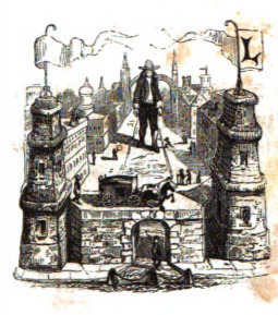 In this image we see Gulliver walking along the main street of Mildendo – the capital city of Lilliput. This image is shown at the beginning of chapter four, in which Gulliver visits the city for the first time. Gulliver’s height is emphasized in this image, however the city itself resembles a European walled city during the eighteenth century. In the foreground we see a guard working at the gate, which also serves as a bridge for carriages. A horse drawn carriage is going across the top of the wall. Flags fly from both turrets of the walls. The street is lined with buildings, likely shops with apartments on the upper floors. Behind Gulliver, we see another arch. Gulliver walks down the middle of the street, with sidewalks on either side of the road. The same image appears in the 1843 Krabbe edition.
