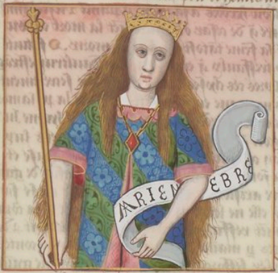 This illumination depicts a portrait of Mariamne, the queen of Judaea. She is illustrated wearing a crown and holding a scepter in her right hand and parchment with her left arm. Mariamne was renowned for her incredible beauty, and for having been the wife of the jealous King Herod. Boccaccio explains that King Herod was so jealous and protective of Mariamne, that he did not want her to outlive him. He devised a plan for someone to murder Mariamne if he were to die before her, so that no one else could have her.