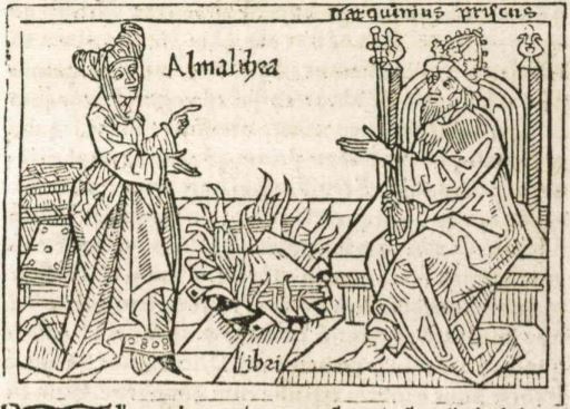 This engraving depicts the sibyl, Amalthea, burning three books in a fire in front of Tarquinius Priscus. We know that these figures are indeed Amalthea and Tarquinius Priscus as their names are engraved beside and above their bodies to identify them. Amalthea, as explained by Boccaccio, brought nine books for Tarquinius Priscus, and when he failed to pay her the full price, she burned three books at a time until he paid her. The word Libri is engraved below the fire, which translates to books in English.