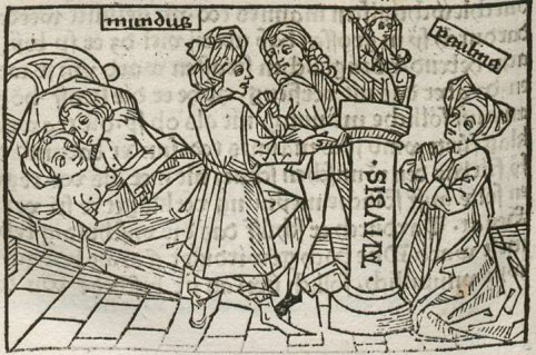 The Roman woman Paulina is depicted on the right side of the engraving as she kneels in prayer. She is looking up at the statue of the Egyptian god Anubis. Paulina’s name is engraved above her head at the top of the image to identify her. The statue of Anubis is sitting on a tall platform, with the name Anubis engraved on the platform. Paulina was an incredibly devout and chaste woman and was completely faithful to her husband. A man named Mundus had fallen in love with Paulina due to her overwhelming beauty, and when she continuously rejected his advances, he devised a plan to have her as his own. Mundus is depicted in the centre of the engraving handing a bag of money to a priest. Mundus bribed the priest of the temple to invite Paulina to sleep at the temple to have an encounter with the god Anubis in her sleep. Paulina stayed at the temple, expecting to have an experience with Anubis, however, Mundus came to Paulina in her sleep and pretended to be the god and convinced her to have intercourse with him. This is depicted on the left side of the engraving. Paulina and Mundus (disguised as Anubis) are illustrated in bed together after having intercourse. Paulina is famous for having been tricked into losing her virtue and chastity. Mundus ended up being exiled, and the priest was tortured for his involvement in the deception.