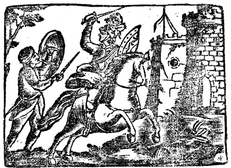 - This image shows El Cid fighting off an enemy. The enemy is most likely a Muslim soldier. The soldier is wearing a turban over his head and he is carrying a shield and a sword. He is wearing armour and he is pointing his sword at the man on the horse. The man on the horse is El Cid. He is wearing armour and a helmet with plumes on it. HE is carrying a sabre and a shield. On the left side a tree is visible and on the right side the tower of a castle wall is visible. On the wall there is a flag hoisted up.