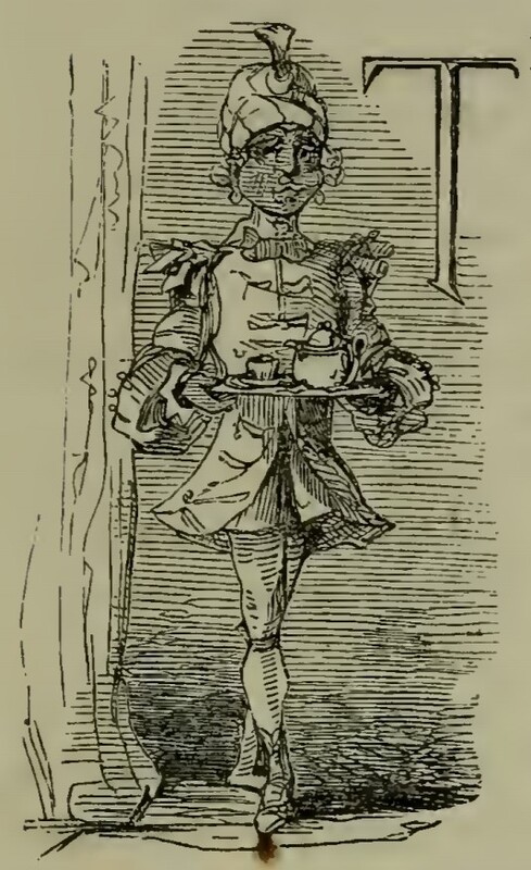 - A servant in a turban and uniform carries a tray containing a teapot and cup and saucer. In the top right of the image is the letter T from The.
