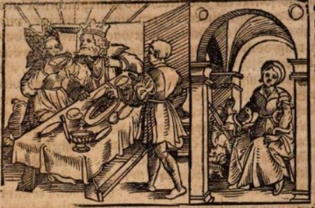 This engraving depicts two separate scenes. The left side of the engraving depicts Queen Cleopatra of Egypt sitting at a dinner table with her husband Antony beside her. Cleopatra had very expensive tastes and demanded a feast which would cost an outrageous amount of money. When Antony did not provide the entire feast Cleopatra demanded, she took out one of her pearl earrings and dissolved it in her drink and drank it to get the luxuriousness she desired. Cleopatra is depicted drinking the pearl in this image. There is a third figure in this scene, which is a man named Lucius Plautus. He was called to be a judge of the feast. The right side of the engraving depicts the suicide of Antony. After realizing the forces of Octavian were on their way to destroy them, Antony plunged his sword into his chest, as depicted in the engraving. Cleopatra is depicted kneeling over his body before she kills herself as well.