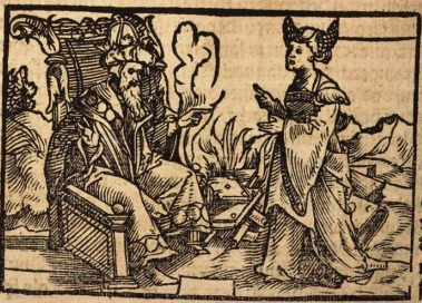 This engraving depicts the sibyl, Amalthea (also known as Deiphobe), burning 3 books in a fire in front of Tarquinius Priscus. Amalthea brought 9 books for King Tarquinius Priscus, and when he failed to pay her the full price for them, she burned 3 books at a time until he paid her in full. These books had the prophecies of Amalthea written in them, which outlined the entire course of the Roman people’s lives and events.