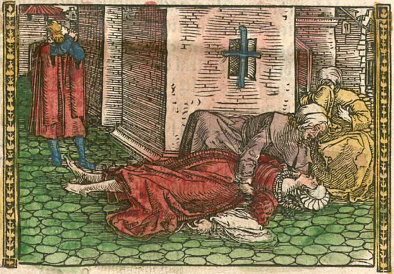 This illustration is interesting, since it is not specified in the narrative that Pleberio (leftmost figure) takes Alisa (central figure, leaning over Melibea) outside to see Melibea’s body, although he does tell her to look at it. It is just as likely that he is asking her to look through the window in their bedchamber. The rightmost figure almost certainly represents Lucrecia, who witnessed the preceding series of events.