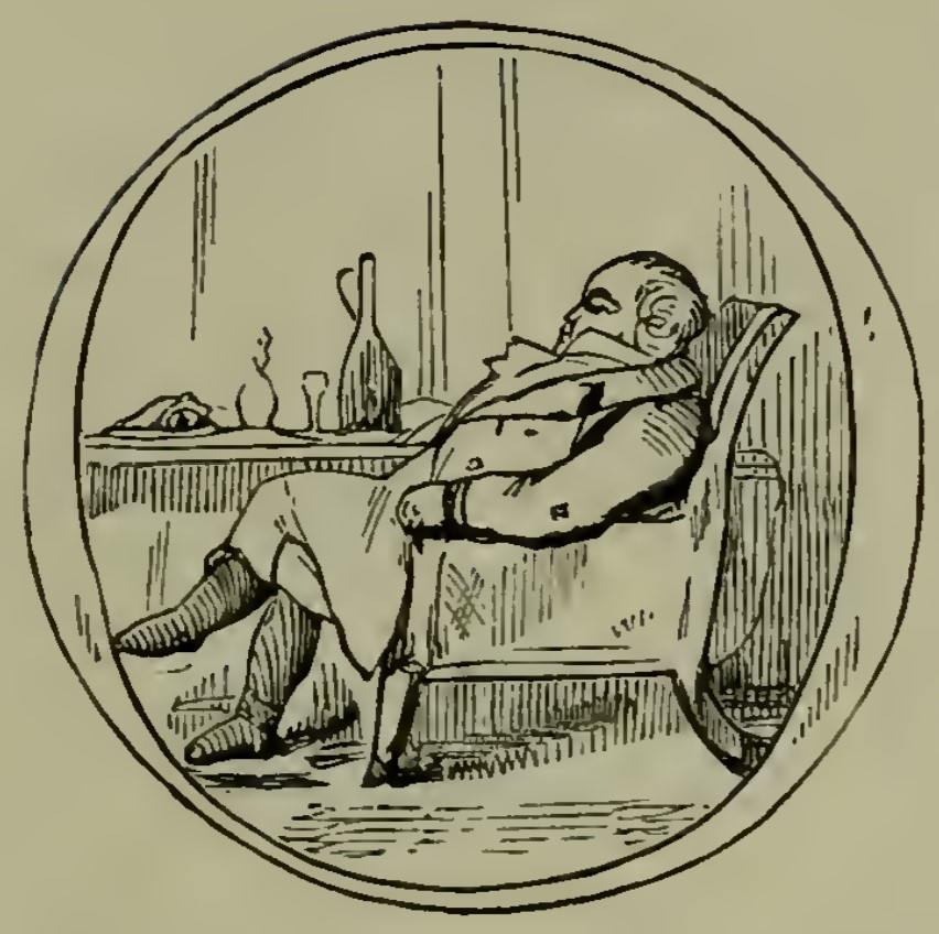 - Joseph Sedley is asleep at the dinner table, leaning back in his chair. On the table in front of him are the remains of dinner, including his plate and cup and a decanter. He is framed in the letter O from On.