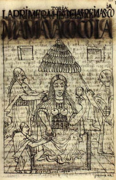This illustration depicts Mama Waco, the first Coya [Queen] and wife of the Inca kings. She married her son Manco Capac Inca and she was well respected in their kingdom. The author describes her to be incredibly beautiful and a practicing sorceress. She is depicted sitting in the centre of the image holding a mirror in her left hand with servants surrounding her. A servant on the right side of the image is shading Mama Waco, and the servants on the left side of the image are brushing her hair and tending to her nails. The words Reyno en el Cuzco are written at the bottom of the image, which translates to She ruled in Cusco.