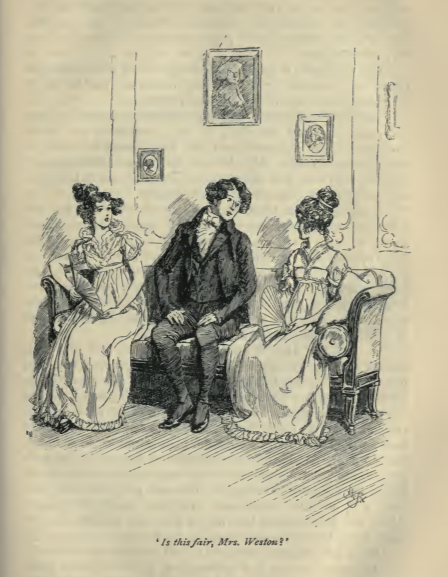 Here we see Mr. Elton sitting between Emma and Mrs. Weston at the Christmas party. Harriet was invited to the party but was ill and could not attend. Emma went to visit her that day, and upon hearing this, Mr. Elton asked Emma not to put herself in danger of getting sick herself by visiting Harriet. He then applied to Mrs. Weston to agree with him, seen here. It was at this party that Mr. Elton proposed to Emma. This scene occurs in chapter 14. The characters are shown in the traditional regency style, with Emma and Mrs. Weston wearing the regency style dress with an empire waist. Their hair is worn up as was the fashion at this time and they carry fans. A fan was often used at evening events by women to communicate with others across the room by moving or holding the fan in a specific manner. Mr. Elton wears a waistcoat and tailcoat with a cravat. The regency period dated to the early nineteenth century (1811-1820) when George, Prince of Wales, later George IV (r. 1820-1830), reigned as regent for his mentally ill father, King George III (r. 1760-1820). The regency period is associated with the rise of neoclassicism in art and fashion.