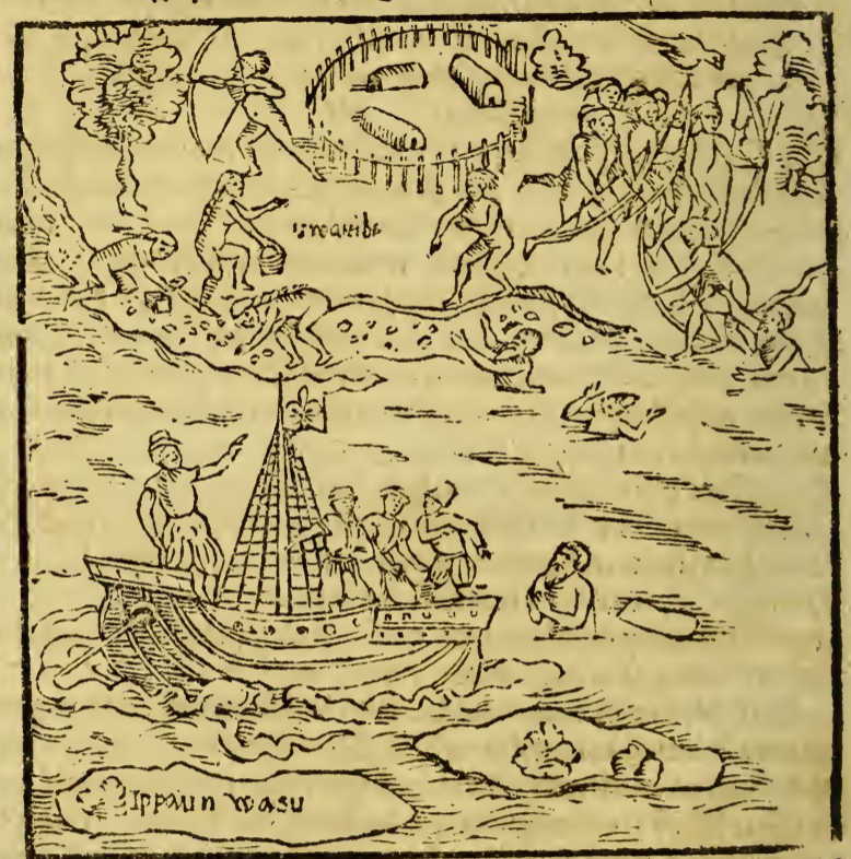 A French ship (identifiable by the fleur de lis on the flag) sails near the coast. A European man (likely representing Staden) is in the water near the ship and appears to be pleading with the men on the ship. Along the shore several Indigenous women pick up objects (possibly shells or rocks) from the ground. The village is comprised of three long structures surrounded by a fence. A group of Indigenous people holding bows stands on the right.