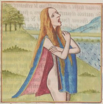 This illumination depicts Turia, a Roman woman and wife of Quintus Lucretius, wrapping her arms around her body as she expresses a look of despair. After her husband had gotten proscribed, Turia kept her husband safe within their house so that he would not have to go to war. She took care of him, and even went so far as to go out in public and pretended to have lost her husband, so that no one would suspect that he was home. This image depicts her pretending to mourn the loss of her husband.