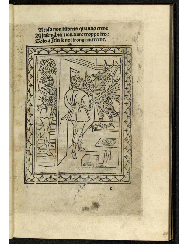 The right-hand three fourths of the image is inside a home. In the lower right corner is a low table with a small stool. Food lays untouched on the table with a cup and a knife. A man is standing up on the left of the stool and table. He is holding a long stick, possibly a sword or some other weapon. He is facing a dragon like creature. It is standing on its hind legs that resemble the feet of an eagle. It has horns and its wings are open. To the left of the man is a door, and on the other side of the door is a seen a man outside holding a snake-like creature. The man is bare-footed, wearing ripped trousers and a blouse. There is a leafy tree behind him in the field that he stands in.