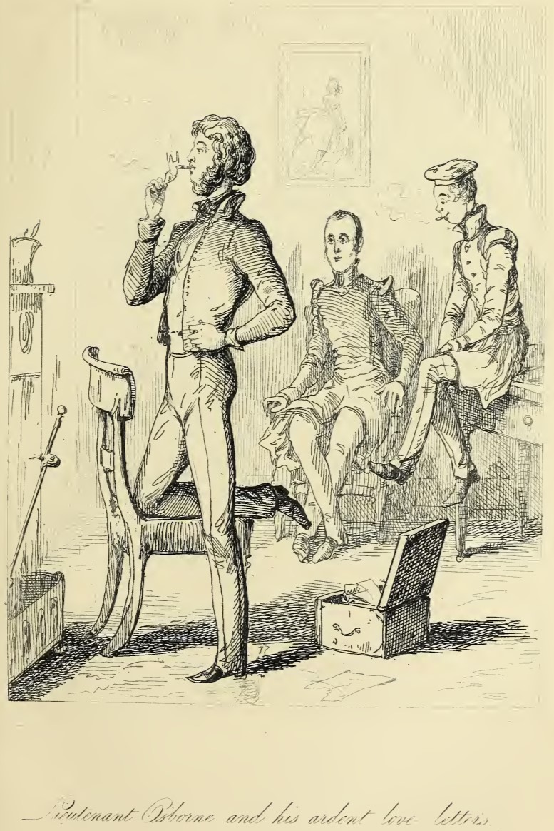 George Osborne stands facing the fireplace with one leg resting on a wooden chair, smoking a cigar which he has lit using a love letter. At the base of the chair is an open chest, filled with letters from Amelia Sedley. Two other officers are seated in the background. One is sitting on the edge of the desk, also smoking. The other is Dobbin, seated in an armchair over which a portrait of a woman hangs, looking appalled. Below the illustration is printed in cursive its title, Lieutenant Osborne and his ardent love-letters.