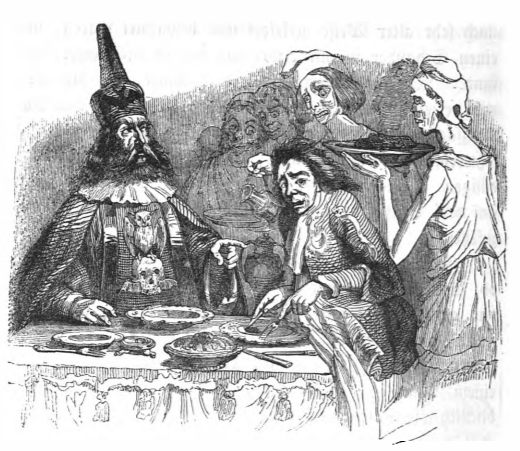 Here we see Gulliver dining with the Governor of Glubbdubdrib, who was a necromancer. Over dinner Gulliver tells the Governor about his time on Balnibarbi. The dinner was served by ghosts, and Gulliver is visibly uncomfortable. Gulliver tells us that over time he became used to the sight of the ghosts. The ghosts are very skeletal and gaunt, and the Governor could make them disappear with a snap of his fingers. The Governor wears robes with a skull and an owl on the front, and a pointed cap. The same image appears in the 1839 Krabbe edition.