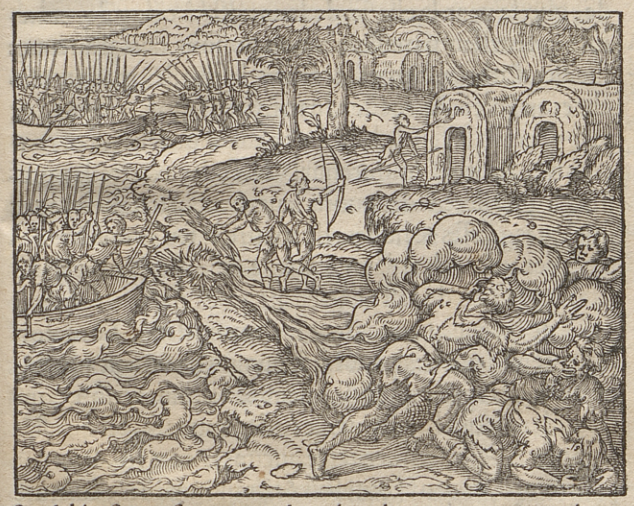 A group of Indigenous Canadians (identified as such by the author) attacks the village of another group. The attackers arrive by canoe, bearing spears, bows and arrows, and torches. Some of them set fires along the shore and in the village. A few individuals on the right flee the fire by running and crawling away in an attempt to avoid the smoke. This image is identical to one found in Frankfurt, 1557.