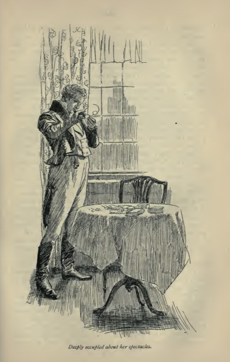 In this image Frank Churchill fixes Mrs. Bates glasses. Frank Churchill and Emma went into town and Miss Bates came into the store and asked them to come in. Emma initially refused, needing to finish her errands. Frank Churchill went in, and when Emma arrived, he was fixing the elderly Mrs. Bates’ glasses. This scene occurs in chapter 27. The characters are shown in the traditional regency style. Emma wears the regency style dress with an empire waist. She looks down at the sofa where she was sitting, putting her fan down. Frank Churchill wears a waistcoat and tailcoat, with a cravat and breeches. The regency period dated to the early nineteenth century (1811-1820) when George, Prince of Wales, later George IV (r. 1820-1830), reigned as regent for his mentally ill father, King George III (r. 1760-1820). The regency period is associated with the rise of neoclassicism in art and fashion.