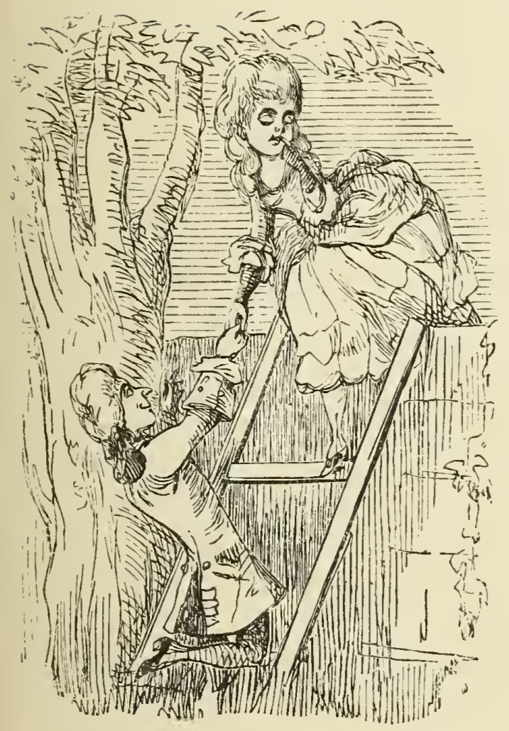 Two figures are climbing over a wall using a ladder placed next to a tree. The man, representing Captain Rawdon Crawley, is at the bottom of the ladder, holding the hand of the woman. She represents Rebecca Sharp, looking backwards as she climbs over the wall and onto the ladder. The ladder forms the letter H from How.