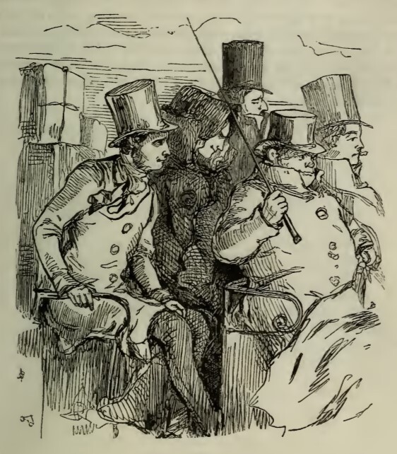 Five figures, four men in tall hats and a woman a dark coat, sit upon a public carriage travelling from London to Queen’s Crawley. At the right of the picture, in the box, are the coachman and Sir Pitt, holding a crop. Behind them are a young man from Cambridge, who has lent one of his coats to Rebecca Sharp, who sits between him and the final man. On the left of the picture is the front of the pile of luggage stacked on the carriage roof.
