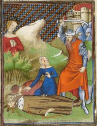 This illumination depicts Hecuba, the queen of Troy, on the left side of the image watching her husband and children die at the hands of the Greeks. Boccaccio explains that he wrote on Hecuba to highlight her terrible misfortunes. Her husband, King Priam, is illustrated laying on the ground with wounds on his chest. He is depicted wearing a crown to identify him. One of Hecuba’s daughters is depicted sitting beside her brother’s and father’s dead bodies as she looked at the Greek soldiers behind her. Along with watching her loved ones violently die, Hecuba watched her entire city fall to the ground. The city of Troy is depicted in the background on the right side of the image.
