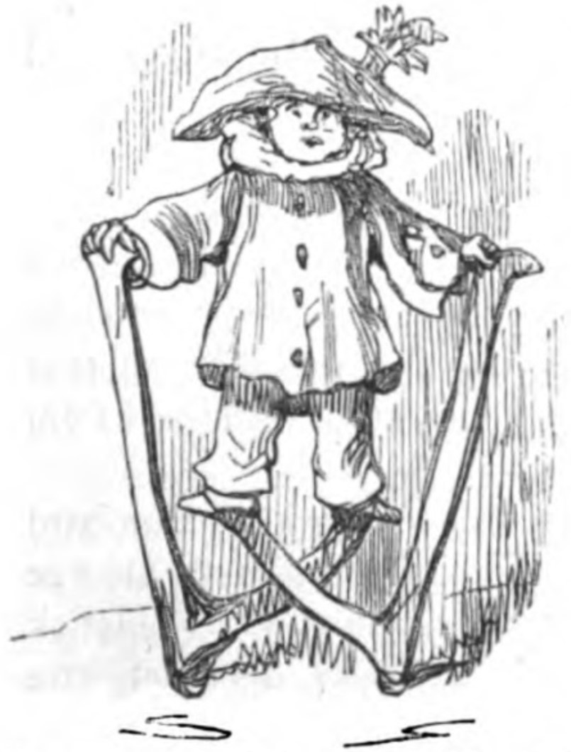 - A figure in oversized clothes, a neck ruff, and a feathered hat stands on a pair of crossed stilts, which form the letter W from When.