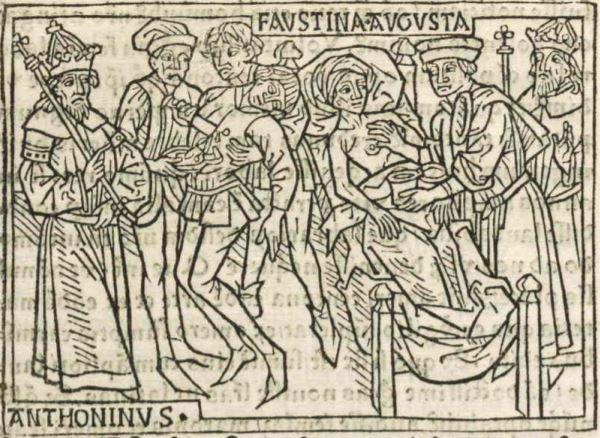 This engraving depicts Faustina Augusta, the wife of emperor Marcus Aurelius Antoninus, on the right side of the engraving lying in a bed. The creator engraved her name above her head to identify her. There is a doctor hovering over her body while rubbing an ointment over her chest to cure her illness. Her husband, Marcus Aurelius is standing behind the doctor. Faustina Augusta had fallen ill due to being passionately in love with a gladiator, and her husband Marcus Aurelius sought the help of a doctor. The doctor suggested killing the gladiator and using his blood to cure her of her sickness and overwhelming lust for him. Marcus Aurelius Antoninus is depicted on the left side of the engraving wearing a crown and holding a scepter as he watches his men kill the gladiator his wife was in love with. One of the men is holding a bowl underneath the gladiators wounds so they can use the blood to treat Faustina Augusta.