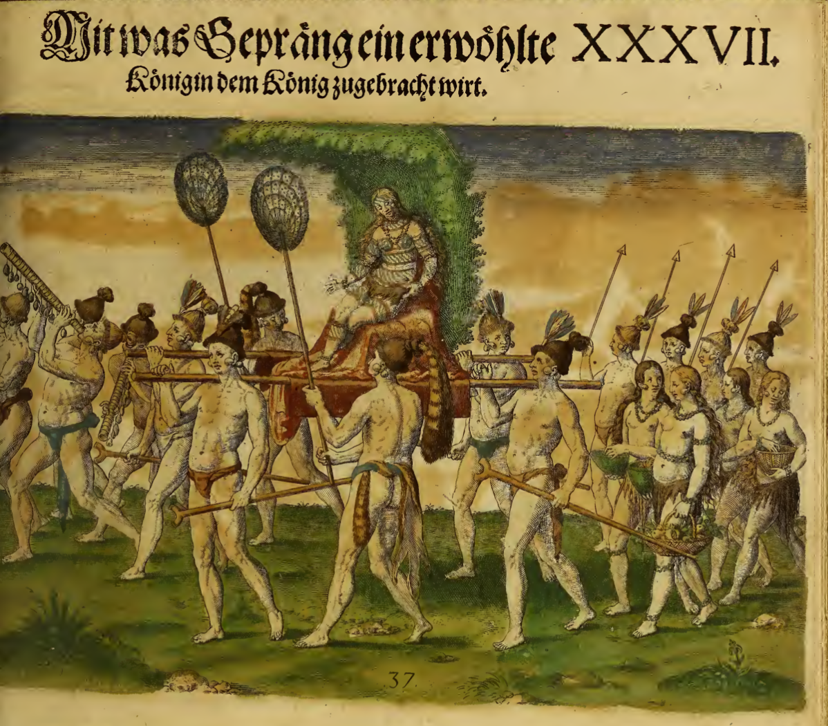 The chosen queen is carried on a litter by four men. Her body is decorated with paint or tattoos, and she wears strands of beads around her neck, arms and legs. Several men in front of the procession play large instruments, and a man walks on either side of the litter each waving a fan beside the queen. Behind the procession several women and men, the women carrying baskets and the men spears. This illustration is identical to the one found on page 117 of Frankfurt 1591, but colored.