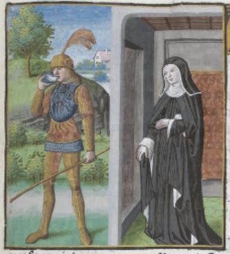 This illumination depicts Antonia, the daughter of Mark Antony and Octavia, standing on the right side of the image wearing black as she mourns the death of her husband, Drusus. Drusus had been away on a military expedition when his older brother, Tiberius, poisoned him. Drusus is on the left side of the image dressed in his armour and military gear as he drinks the poison from the goblet in his hand. Boccaccio wrote on Antonia to praise her for her chastity and remaining a widow for her entire life following her husband’s death.