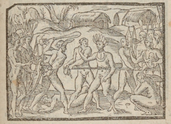 An Indigenous man has been taken captive by another Indigenous group and is about to be executed. He is restrained by a rope tied around his waist, with each end of the rope held taut. The captive wears a feathered headdress and a necklace. Another man stands beside him holding a club raised over his head, poised to swing. There is a body lying on the ground behind the man with the club. Groups of people stand on either side of the captive to watch the execution, most of the men hold bows or clubs and at least one woman has a small child in a sling against her chest. Another woman crouches beside the prisoner with her hands over her face in distress. Several structures are visible in the background. This illustration is a simplified and mirrored version of the one found on page 76 verso of Paris, 1557.