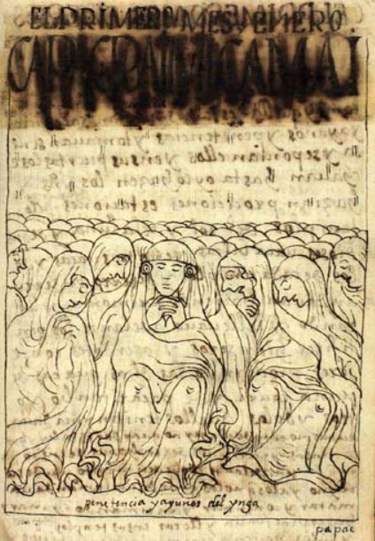This chapter is dedicated to discussing the traditions and rituals of each month during the Inca Empire. The Incas tracked the months and years through the stars and their months consisted of thirty days. This image depicts the month of January, which was dedicated to sacrifices, seeking penance and fasting. Capac Raymi Camay Quilla translates to Royal Feast, Festival of the Moon. The image depicts a large group of people sitting together in a ceremony and appear to be praying. The caption on the image reads penitencia y ayunos del ynga, which translates to penance and fasting of the Incas.