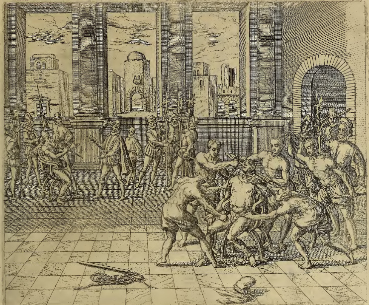 Inca Emperor Atahualpa (Atabalipa) is executed at Cajamarca, despite the ransom of gold and silver having been paid. Atahualpa is seated in a chair with his ankles chained together, inside a large open room. A group of enslaved Black people are forced by the Spanish to carry out his execution. Several men hold down Atahualpa’s limbs while two behind him strangle him to death with a rope tied to a wooden pole. Groups of Spanish soldiers armed with pikes and muskets mill around the room while the execution takes place. This image is identical to one found on page 11 (131) of Frankfurt, 1596.