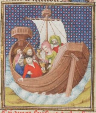 This illumination depicts Theoxena, her husband Poris, and her nephews and child killing themselves. They are illustrated on a ship as they had attempted to escape King Philip of Macedon by sea, however, their ship was being pulled back to shore by the winds. To avoid dying at the hands of King Philip, Theoxena had given them all a choice between stabbing themselves with knives or to drink poison. Theoxena is depicted holding a chalice full of poison while a child in front of her holds one as well. Theoxena and her husband decided to die as a couple and jump off the ship and drown together.