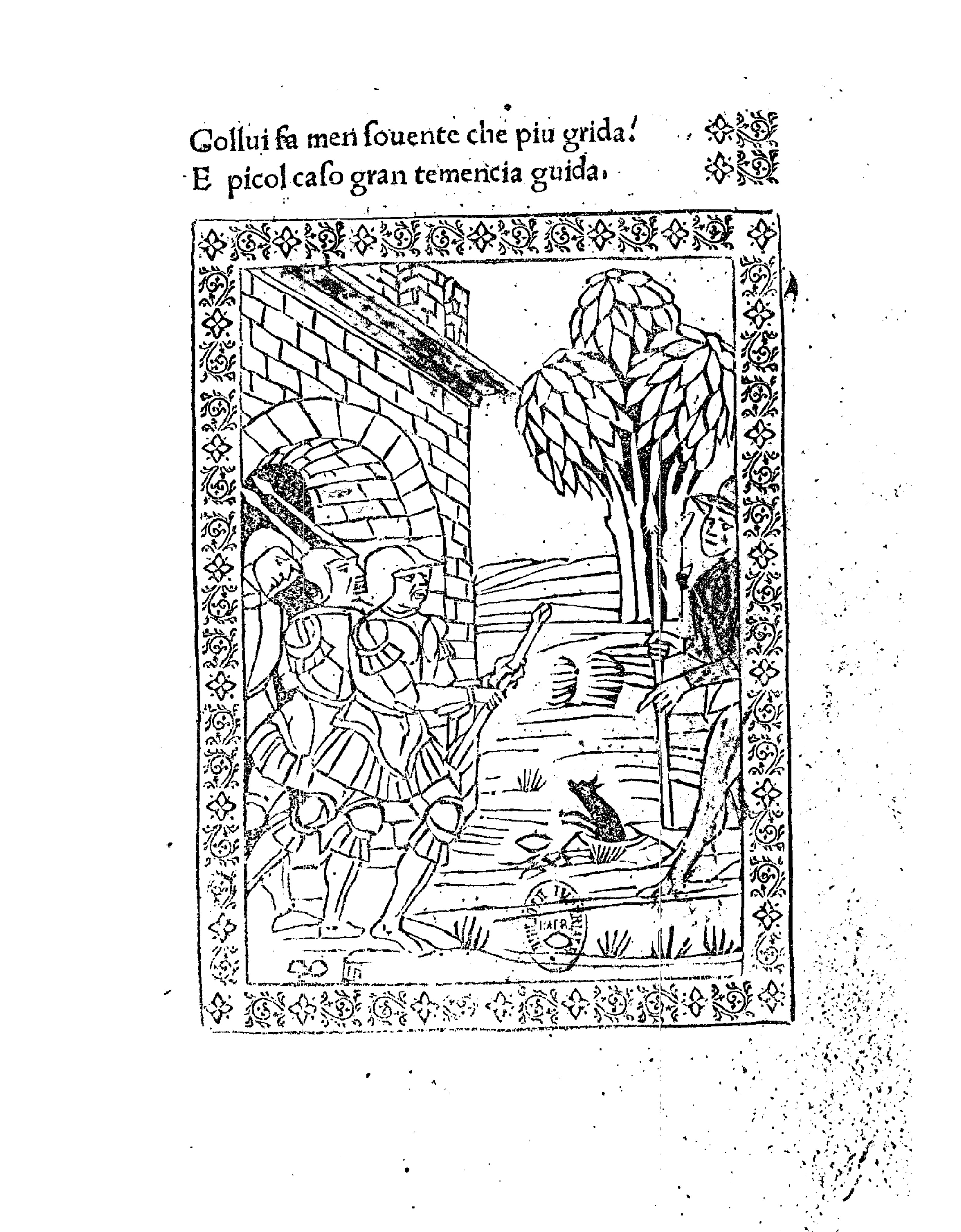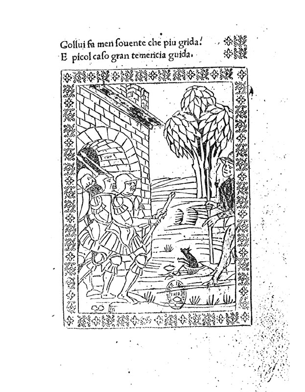 Three men exit a castle directly behind eachother, the first holds a staff and looks stirn, the second looks almost afraid, and the third is looking towards the ground and seems sad. To the right is what looks like a wizard holding a long staff. An indistinguishable anamal looks like it is coming out of the ground infront of the wizard. A large tree is in the background. The image is bordered by a vine design and the signature of Liberale de Verona is stamped on the bottom