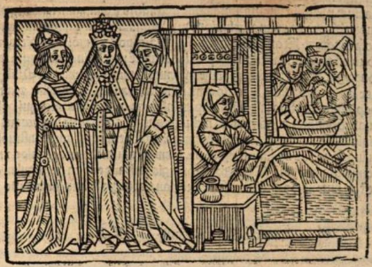 The left side of this engraving depicts Constance, the daughter of King William of Sicily, marrying Henry, the emperor of Rome. Constance was forced to be a nun at a young age due to a prophecy which foretold Constance would somehow cause the destruction of Sicily. Her father, William, put her in a convent to prevent the prophecy from happening. At an older age, Constance was married to Emperor Henry and bore a son at the age of 55. Constance is depicted on the right side of the engraving lying in a bed after giving birth to her son, Frederick. Frederick is depicted getting baptized in the background of the image in a large bowl. The baby grows up to be the one to fulfill the prophecy that King William was fearful of.