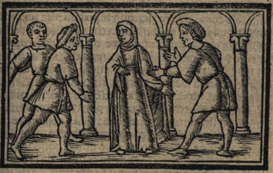 In the centre of the illustration, we see Celestina wearing a robe and a veil. There are two male figures to the left and one to the right, representing Calisto, Sempronio, and Pármeno. This depicts the scene in which Celestina tells Calisto about her visit with Melibea, after which she presents him with Melibea’s girdle.[This illustration is identical to those found in Acts IV (folio 32r), V (folio 42r), VIII (folio 62r), X (folio 74r), XIII (folio 93v), XV (folio 102r), and XVII (folio 109r).]