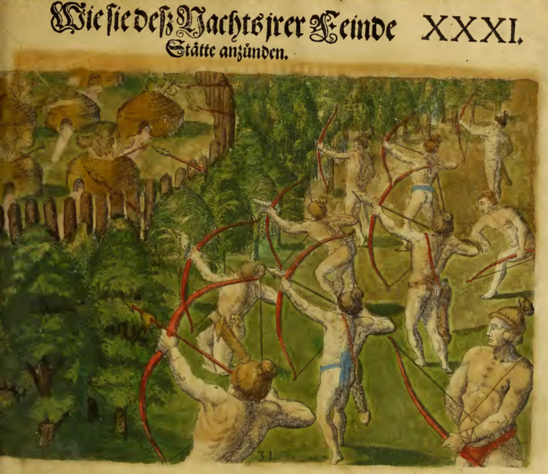 A group of Indigenous men stand outside a town. They are using large bows to fire arrows over the trees and fence surrounding a town. The arrows have been set on fire and they spread flames to the roofs of the houses in the town when they land. This illustration is identical to the one found on page 103 of Frankfurt 1591, but colored.
