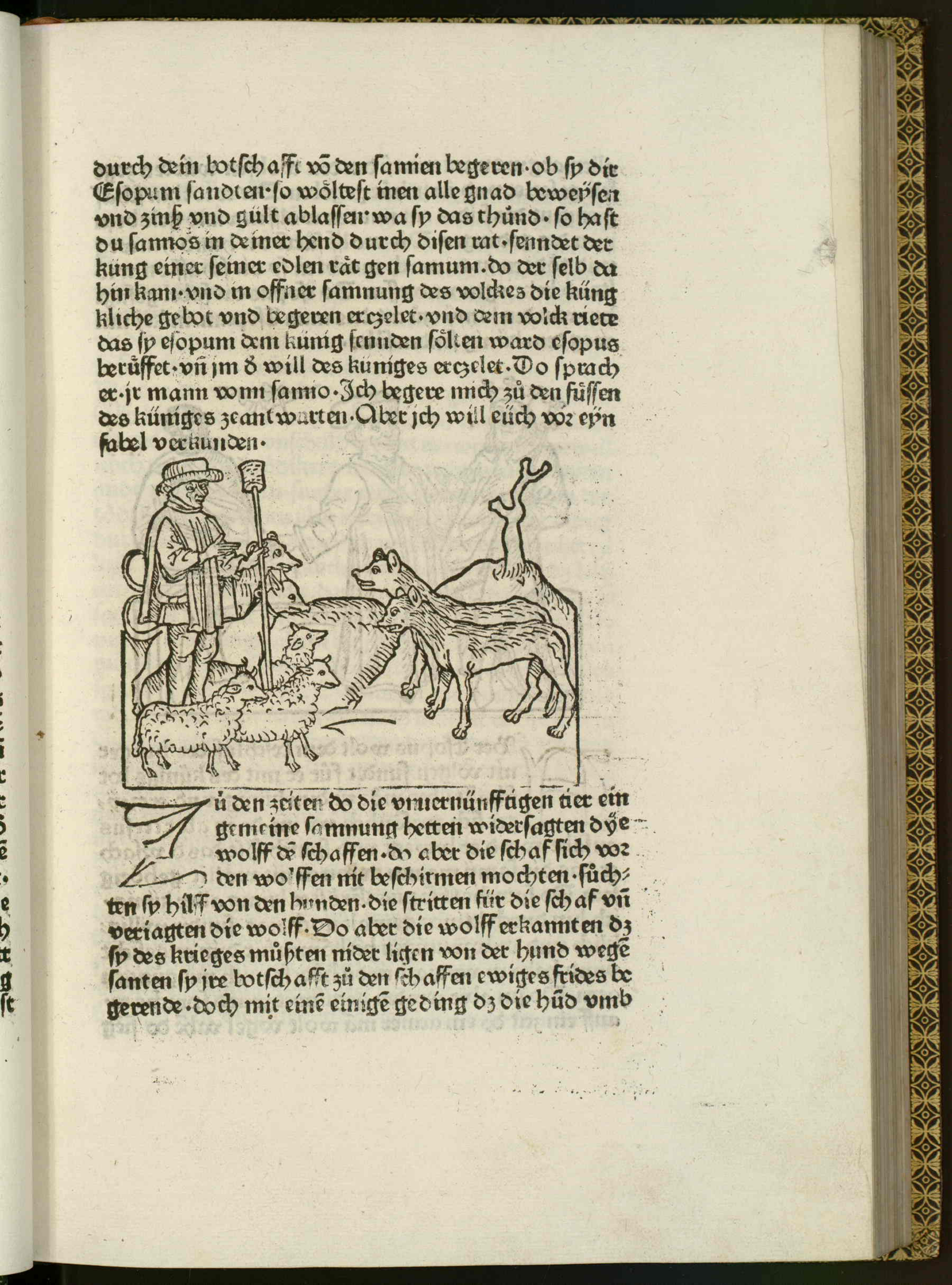 There is an illustration at the center of the page; above and below this illustration are bodies of text. In the illustration, a man wearing a hat is holding a stick while having 5 dogs like animals beside him and with two dog like animals in front of him. A tree branch can be observed in the background.