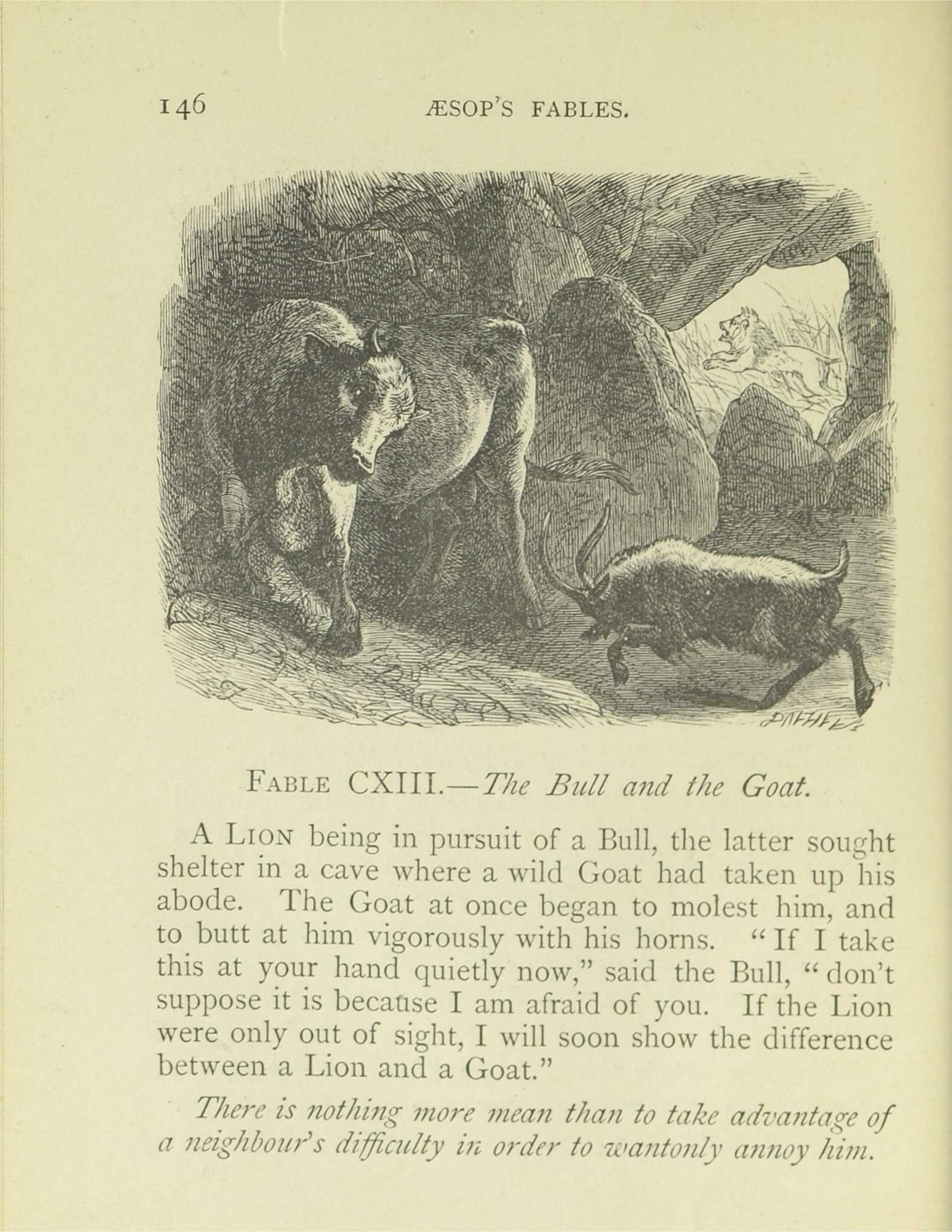- In a cave, a bull and a goat face each other. The goat, to the right, is attempting to butt the bull with his horns. Outside the cave, a lion prowls.
