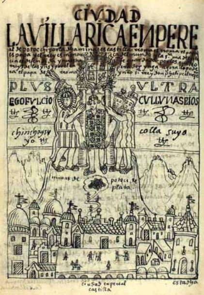 This image depicts the rich, imperial town of Potosí, which is now in modern-day Bolivia. The town is arranged in a large cluster of buildings at the bottom of the image which forms a square in the centre where people can be seen walking or riding on horseback. A mountainous landscape is depicted behind the city to highlight the importance of the silver mines. There is a long pathway leading into a hole in the mountain where it reads minas de potoci de plata [silver mines of Potosí]. The top of the image depicts the Inca ruler in the centre and four of his loyal kings surrounding him. They are holding the symbols of imperial Spain which is their coat of arms and the columns of Hercules. The author incorporated this into the image to show the support that Peru and the Inca’s gave to Spain. The large caption at the top of the image reads, Por la dicha mina es Castilla, Roma es Roma, el Papa es Papa y el rrey es monarca del mundo. Y la Santa Madre Yglecia es defendida y nuestra santa fe guardada por los quatro rreys de las yndias y por el enperador ynga. Agora lo podera el Papa de Roma y nuestro senor rrey don Phelipe el terzero [For the mine is Castile, Rome is Rome, the Pope is the Pope, and the king is the monarch of the world. And the Holy Mother Church is defended, and our holy faith guarded by the four kings of the Indians and by the Inca emperor. Agora will be the power of the Pope and Rome and our Lord King Philip the Third].