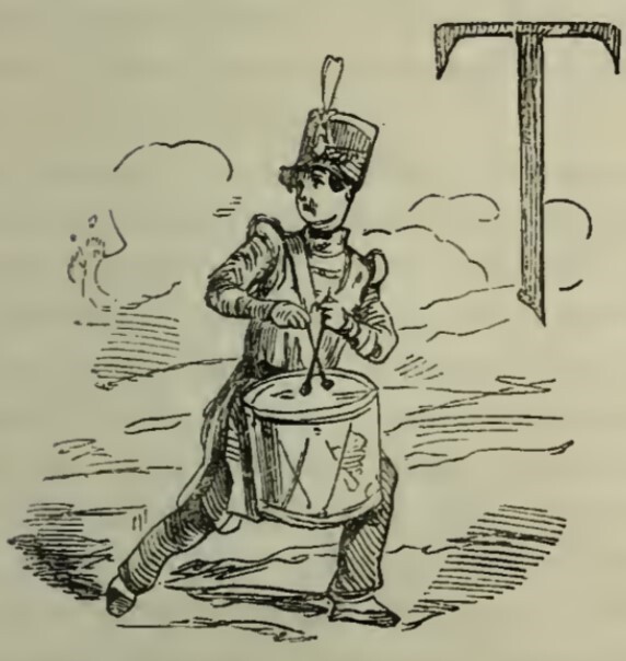 - A drummer boy glances fearfully around the battlefield as he plays a beat upon his drum. The background is of low hills covered in clouds of smoke, with the letter T from Thus in the top right corner.