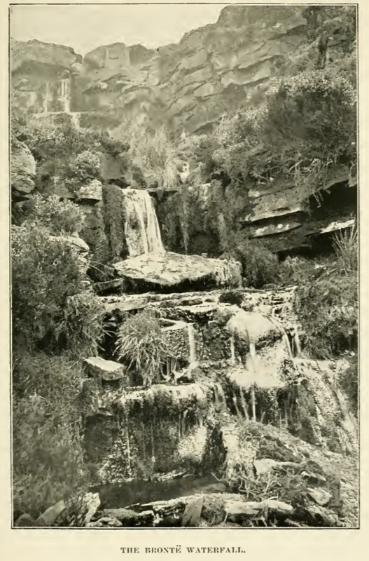 Here we see an image of the ‘Bronte Waterfall’. It is located in West York, near Haworth, England. It is part of the moorland and farmland nicknamed ‘Bronte Country’, a region of West York, south of the Pennine Hills, where the Bronte sisters wrote their most famous works. The image is a reproduction of a photograph using a technique called photogravure, where photographs are taken on plates which could then be etched on to create a plate for use in a printing press.