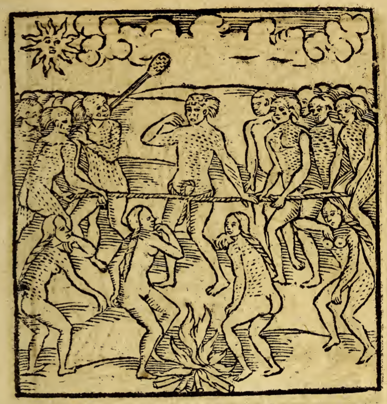 A group of Indigenous Tupinambá people are gathered to witness the execution of a prisoner from another Indigenous group. The prisoner is a man, he is restrained by a rope tied around his waist with the ends of the rope held on both sides by members of the capturing group. A man on the left holds a club raised over the head of the prisoner, ready to strike. Four women stand beside a fire watching the execution.