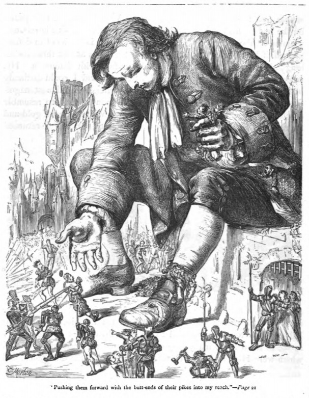- The Lilliputian guards were threatening Gulliver with their spears. Gulliver picks one of them up and acts as though he were going to eat them. He pushed the rest of them away. This was meant to scare the guards and make them leave him alone.